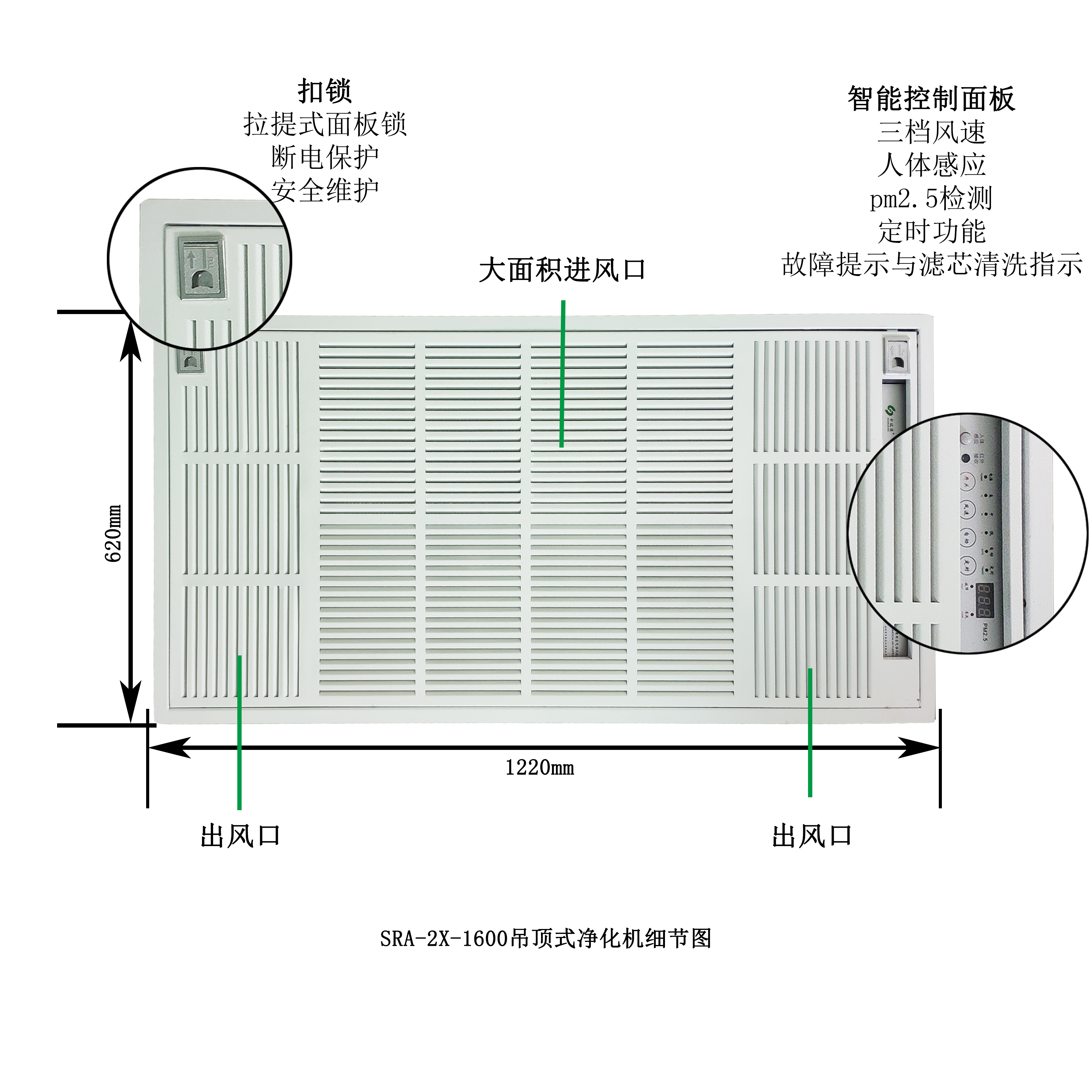 SRA吊頂式空氣凈化機(jī),獨(dú)立凈化,無(wú)需外排,不用鋪設(shè)管道。通過(guò)凈化機(jī)內(nèi)置電機(jī),氣流從進(jìn)風(fēng)口吸入,進(jìn)行凈化處理后,潔凈空氣直接循環(huán)在室內(nèi),持續(xù)凈化。 該凈化機(jī)可完全消除空氣中直徑大小為0.01μm的香煙煙霧、細(xì)菌、飄塵等有害物,有效去除空氣中的臭味、異味等,空氣濾凈效果達(dá)99%以上。