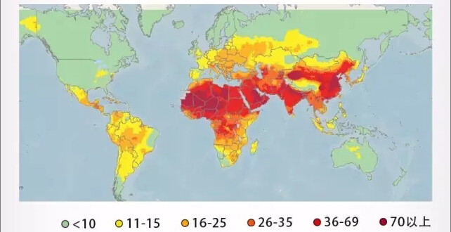 全球年均PM2.5(微克每立方米)濃度分布圖